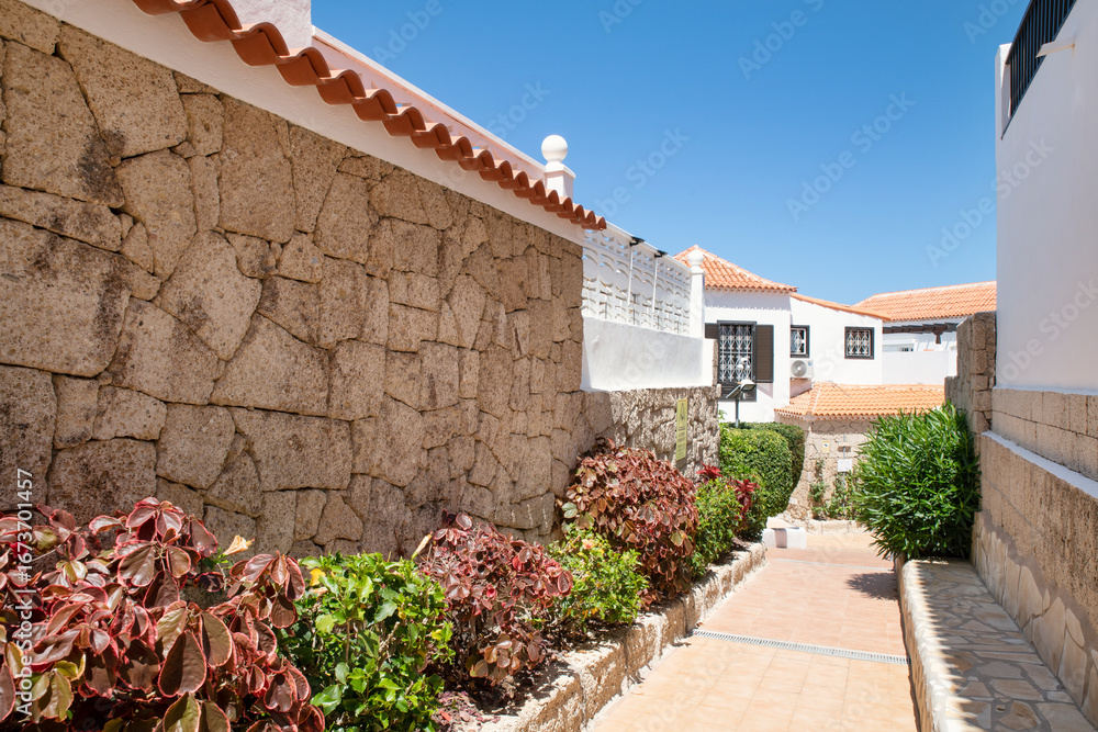 Charming pathway lined with rustic stone walls, decorative plants with lush leaves and red-leafed shrubs connecting the whitewashed houses, part of a holiday resort in Tenerife, Canary Islands, Spain