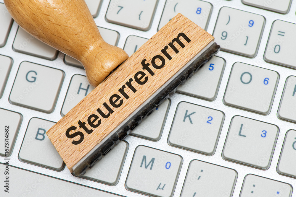 Ein Holzstempel ist beschriftet mit Sozialreform über einer Computer Tastatur als Symbolbild für notwendige Reformen im Sozialsystem - FOTOMONTAGE