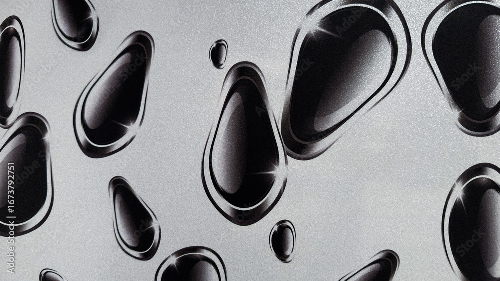 Abstract 3D water droplet texture on metallic silver surface with glossy reflections, modern decorative background for wall design, digital art, and creative interiors.