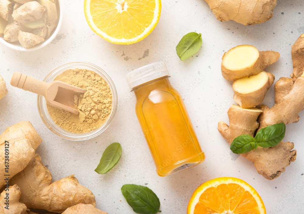 Immune ginger and orange energy shot drink with ginger root and grounded powder on kitchen background.Top view.