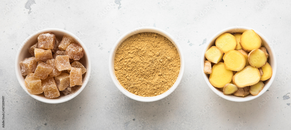 Ginger root slices and powder and ginger cubes with sugar on light kitchen background.Top view.