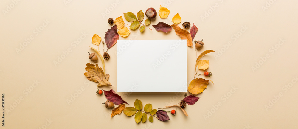 Autumn composition with paper blank and dried leaves on table. Flat lay, top view, copy space