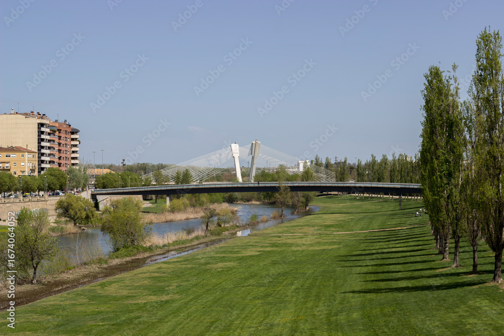 view of green field by river and bridge in distance in Lleida city
