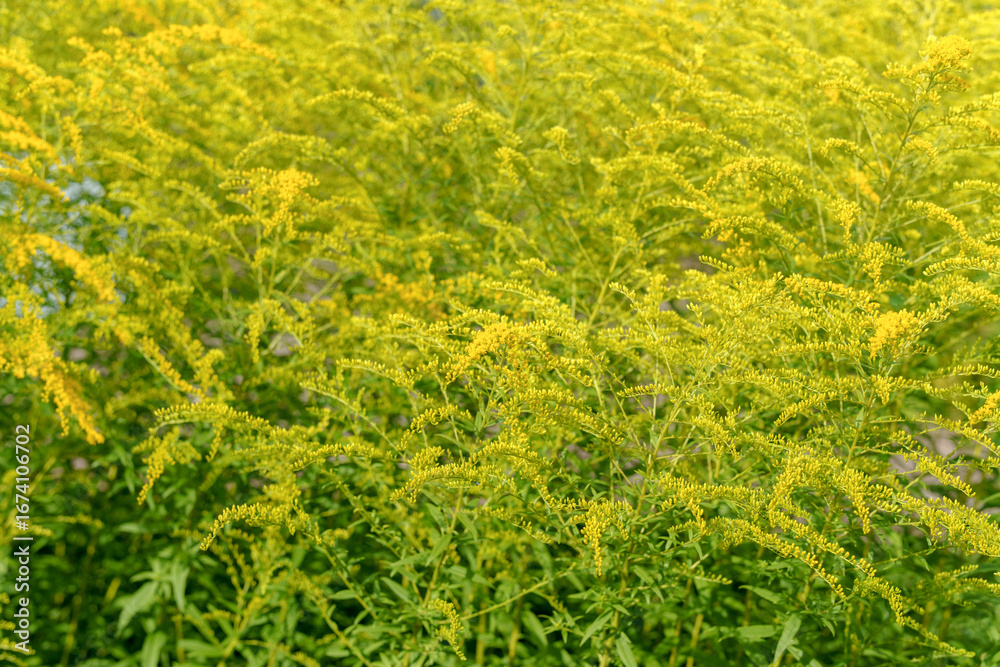 Bright yellow goldenrod flowers fill the field, forming a dense carpet of blossoms. Green stems and narrow leaves enhance the richness of the natural palette.