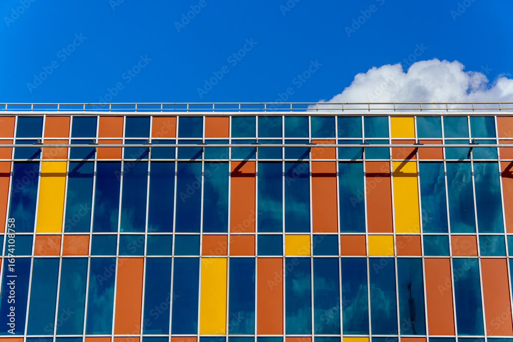 Modern building with a facade of vertical panels in orange, yellow, and blue tones, alternating with large glass windows. In the background, a bright blue sky with a cloud.