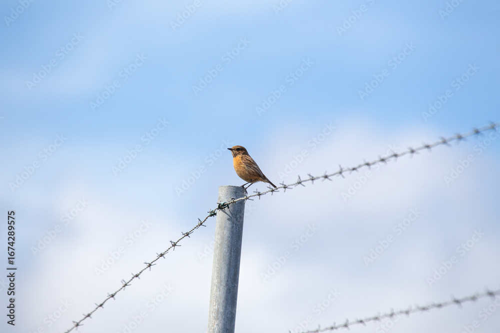 Female European Stonechat (Saxicola rubicola), common in coastal scrub and heathland across Europe