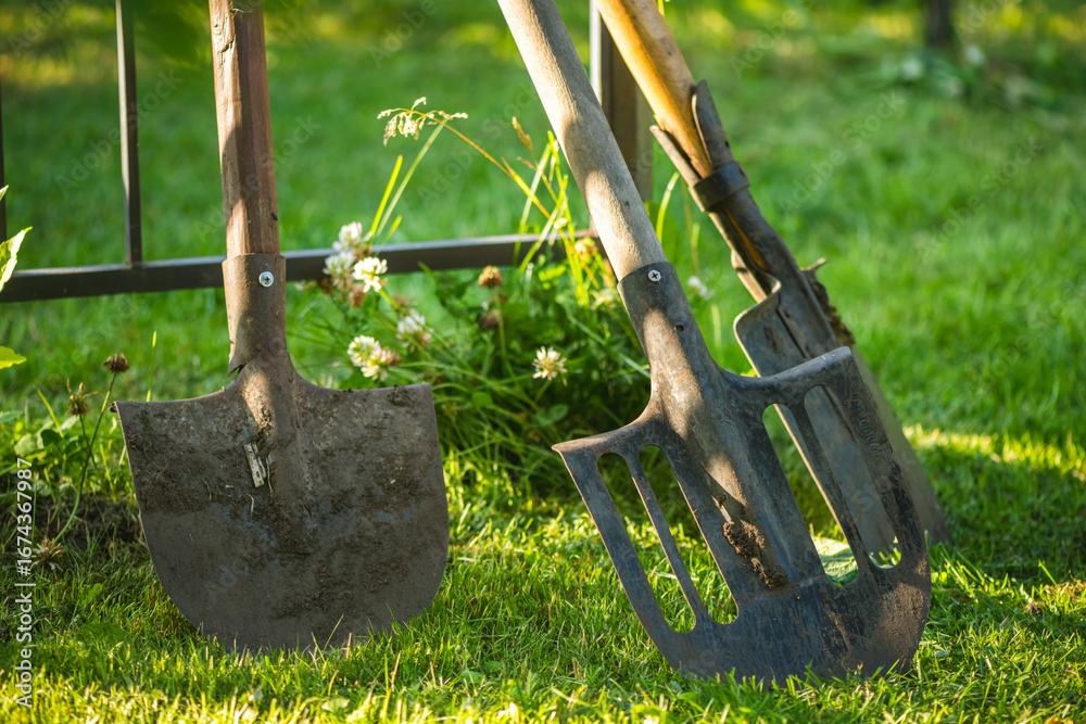Two shovels and a cultivator stand on a lush green lawn near a metal fence, bathed in the warm glow of natural light, ready for the next gardening task