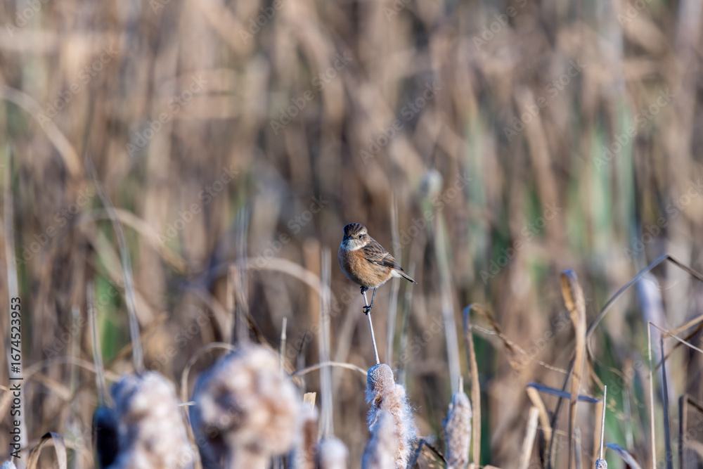 Female European Stonechat (Saxicola rubicola), common in coastal scrub and heathland across Europe