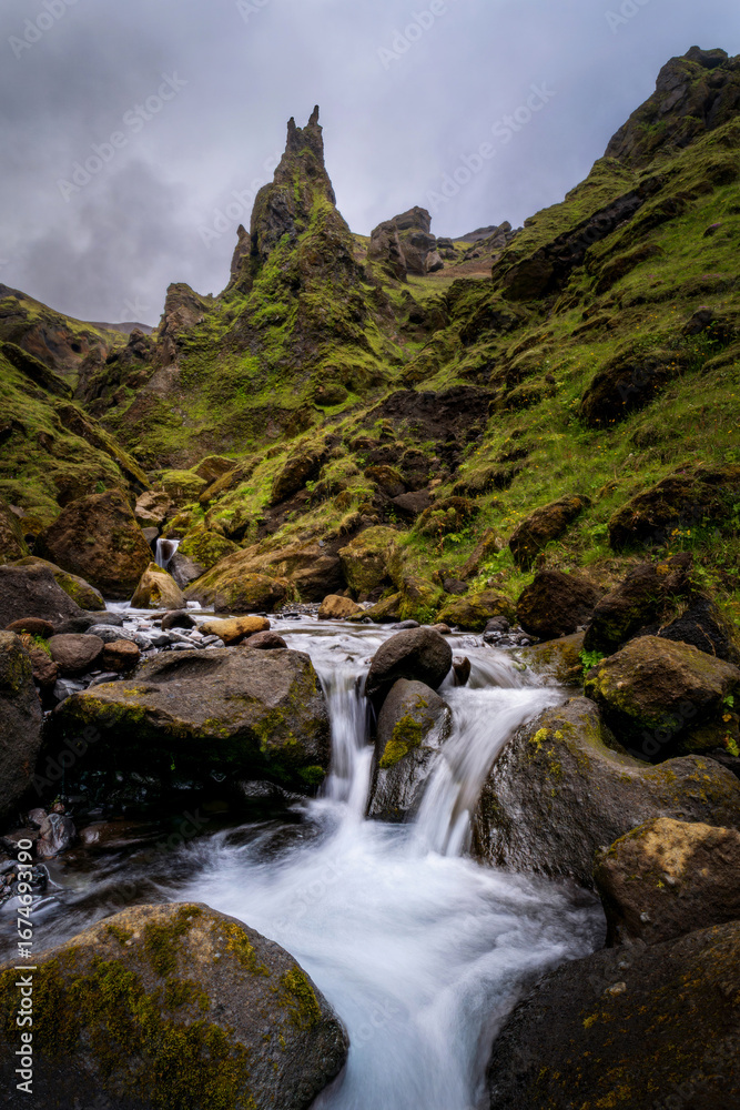 Amazing rock formations covered with moss and small waterfall in Thakgil canyon in Katla geopark, Southern Iceland.