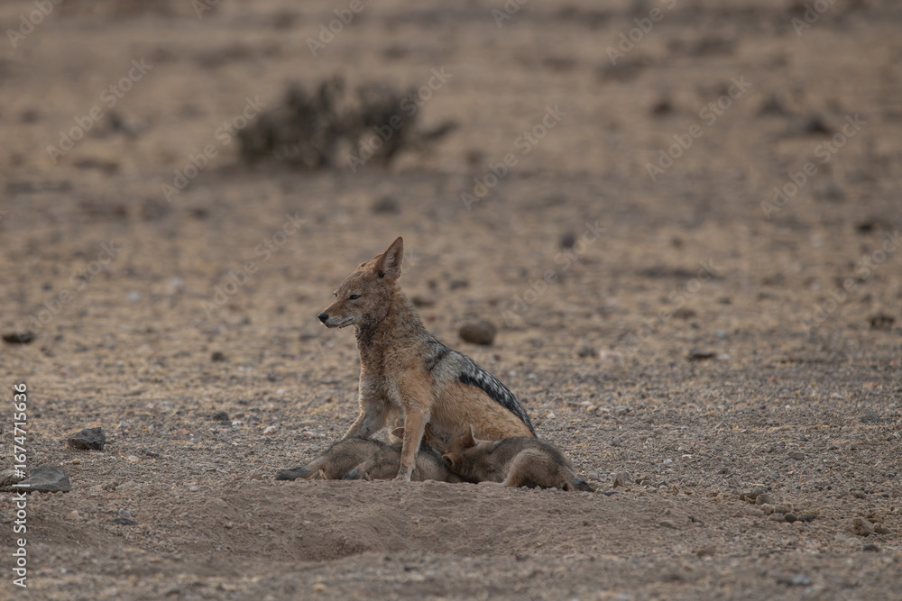 A mother jackal with her pups playing and interacting in Africa in the wild