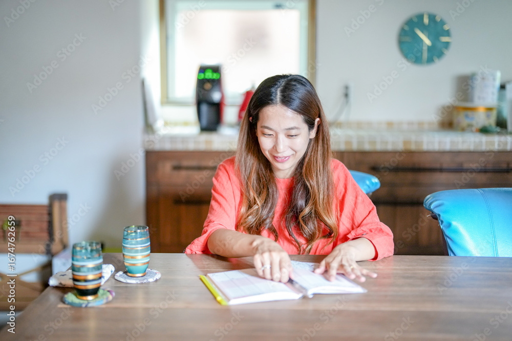 A woman in an orange shirt is reading a book at a table. There are two cups on the table, one on the left and one on the right