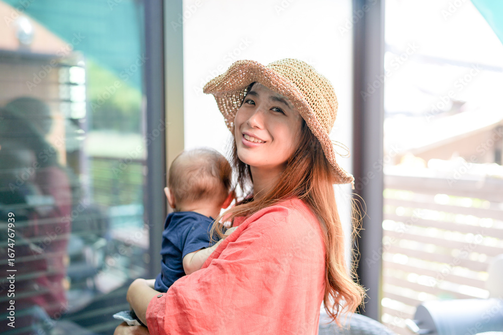 A woman is holding a baby and smiling. She is wearing a straw hat. The baby is in her arms and she is looking at the camera