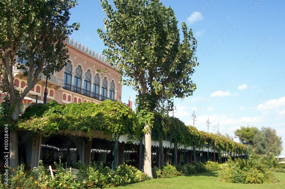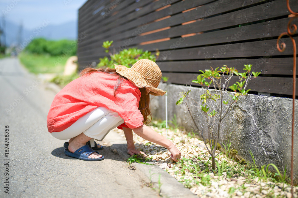 A woman in a red shirt and white pants is kneeling down to pick up some weeds. She is wearing a straw hat and blue sandals