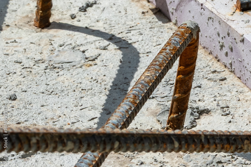 Exposed, rust, mill-scale, covered rebar that is partially encased in concrete. A second concrete pour to cover exposed rebar.