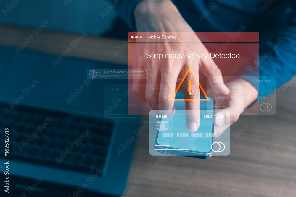Mobile banking fraud alert with suspicious activity warning icon and card graphic, symbolizing financial threat, digital breach, and online transaction risk
