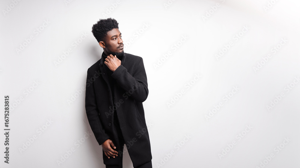 Serious young guy in black clothes looking away at white background