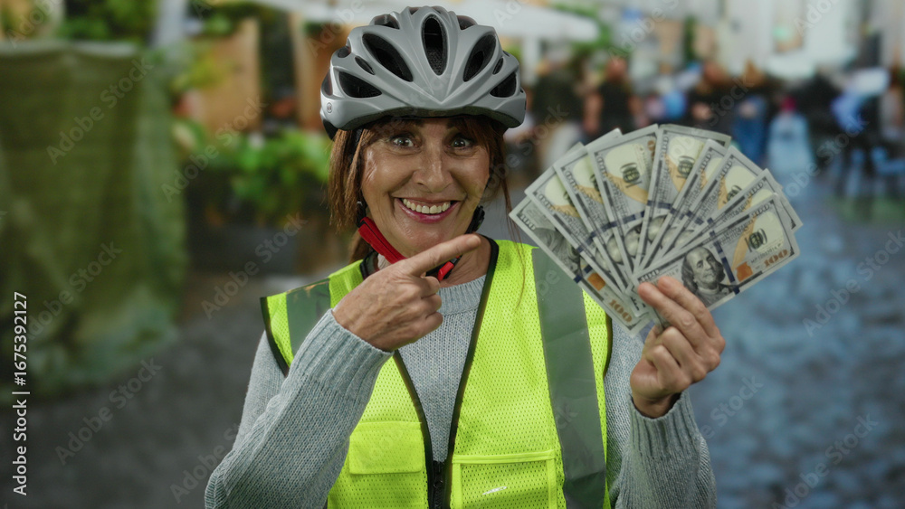 Woman cyclist in city wearing helmet and reflective vest holding and pointing at american dollar bills happily.