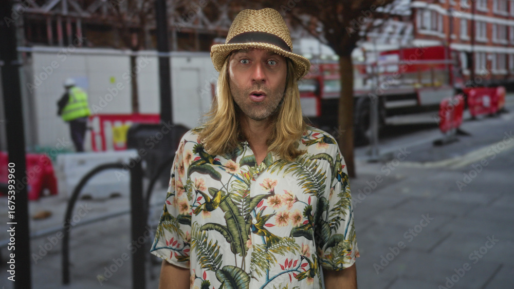 Man in floral shirt wears straw hat and shows open mouth by building on a busy construction site; surprise.