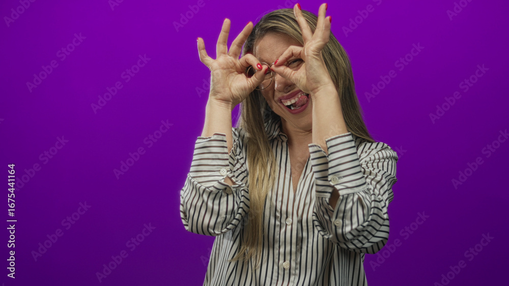Woman frames her eyes with finger circles making a binoculars sign in a purple studio setting; playfulness joy.