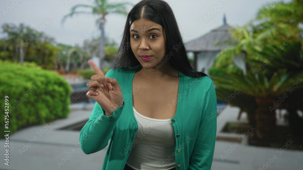 Young latin woman wearing green cardigan pointing finger in building; firm refusal disapproval warning.