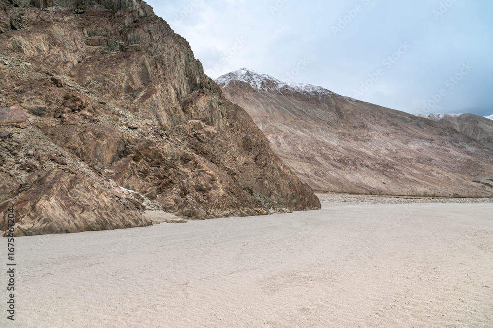 Peaceful Yarab Tso lake in Nubra Valley, Ladakh with white sandy shore, Himalayan mountains, and dramatic cloudy sky. Scenic nature, travel, and meditation background.