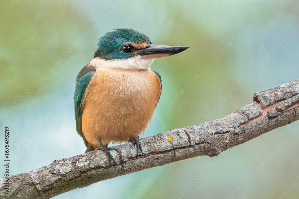 A front-on photo of a wild sacred kingfisher (Todiramphus sanctus) perched on a branch with blurred blue and green background, Australia