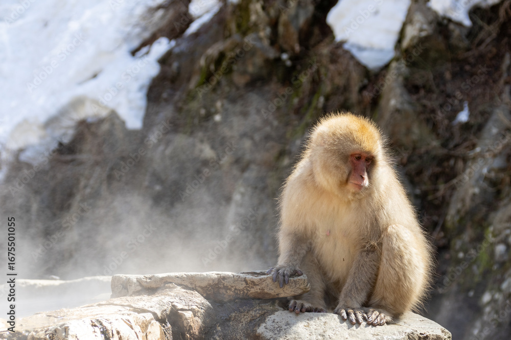 雪の残る谷間で温泉に入ろうとするニホンザル