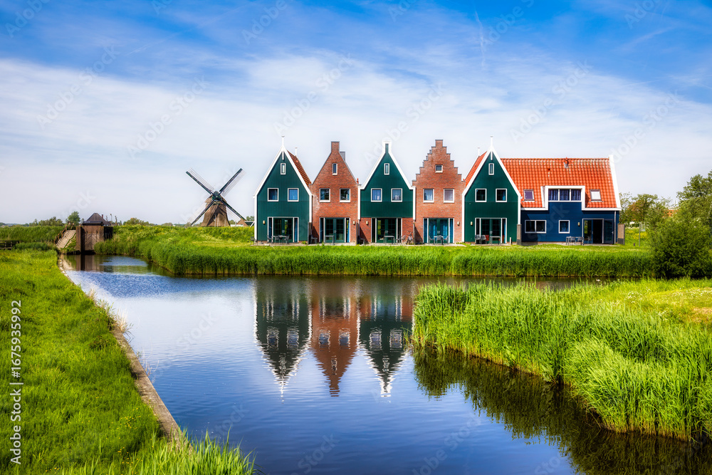 Typical Dutch Scene in Volendam, with a Canal and an Old Windmill