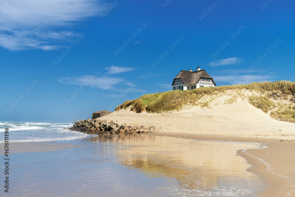 single thatch roof house on top of a sand dune on the beach in Lokken in Jutland