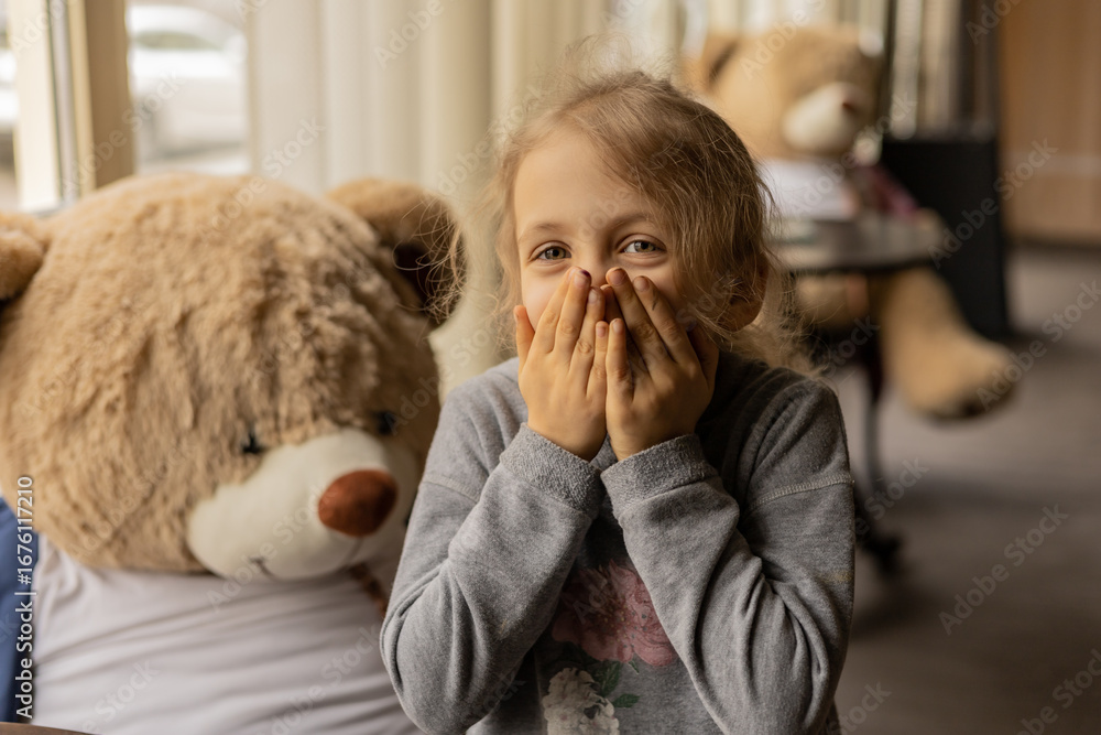 A happy young girl covers her mouth while smiling, standing near a large stuffed teddy bear in a warm and comfortable indoor atmosphere. Joy, surprise, and childhood innocence.