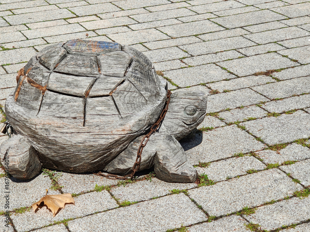 Small carved from wooden street sculpture of turtle, located on grey paving slabs. Handcrafted, weathered object. Close-up. Copy space.