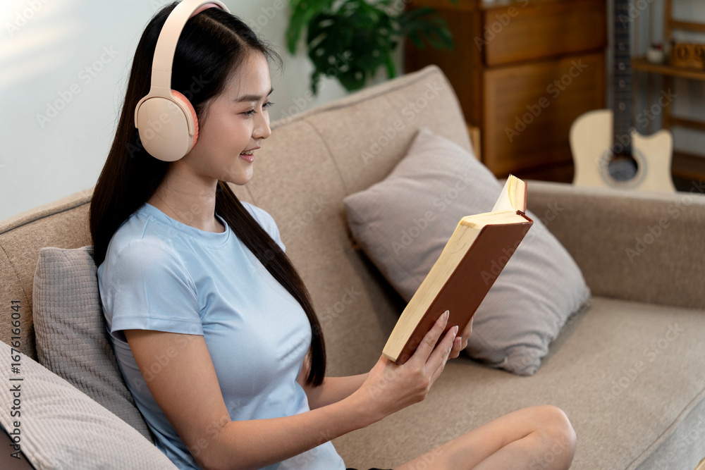Relaxed woman engrossed in reading a book wearing wireless headphones enjoying peaceful quiet moments on cozy sofa at home
