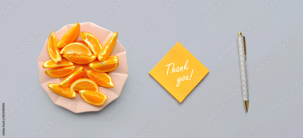 Thank you note day concept. Sticky note with the inscription 'Thank you'. Orange slices on a plate. Ballpoint pen. Orange, pink, gray. A delicious surprise with a message left. Gratitude, minimalism