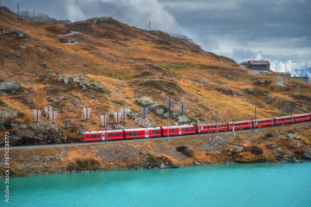 Aerial view of red Bernina Express train curving along the turquoise lake Bianco in the Swiss Alps, rocky hills and dramatic cloudy sky in autumn alpine mountain landscape. Top view of train in