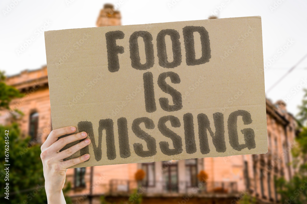 Food Is Missing" highlights famine and blocked humanitarian aid routes, symbolizing hunger, scarcity, and urgent relief needs. HUNGER. STARVATION. POVERTY. SUFFERING. CRISIS. SHORTAGE. RELIEF.