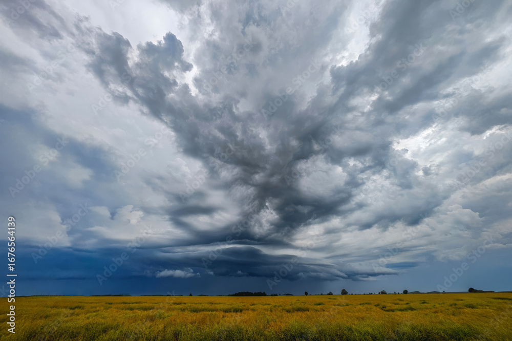 Threatening storm clouds gather over a meadow in a rural area at noon