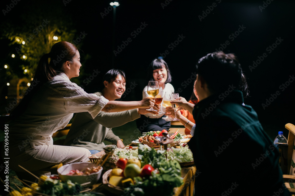 Asian friends toasting wine glasses during a night party in the garden