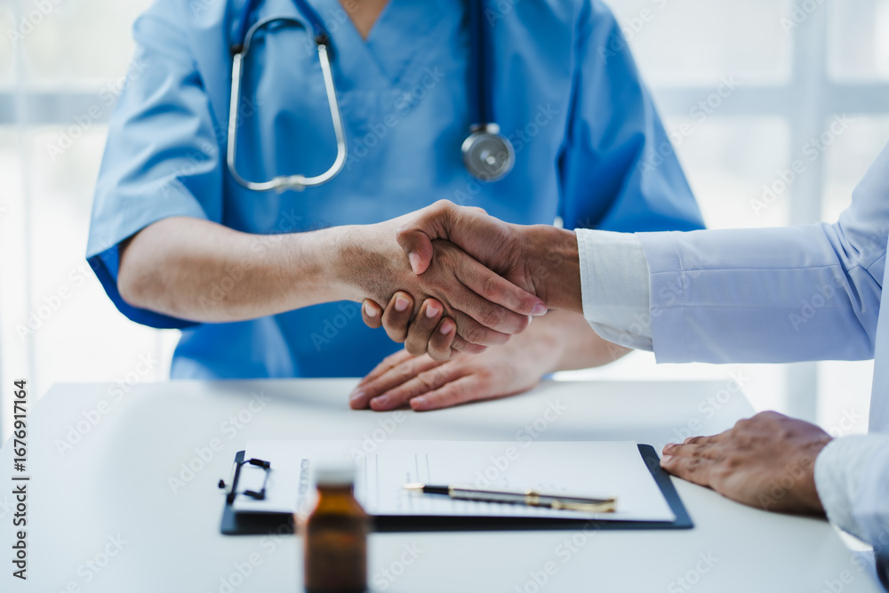 Doctor and surgeon shaking hands after successful surgery