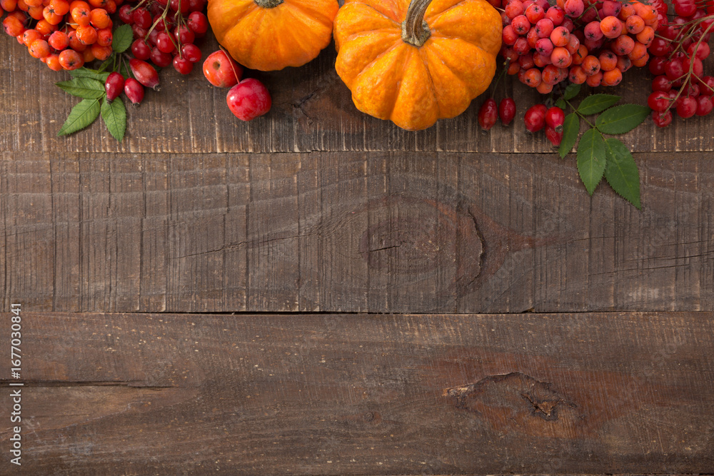 Autumn or Thanksgiving background with pumpkins, bunches Viburnum berries, Rosehip berries, bunches Sorbus berries. Colorful autumn vegetables and berries on wooden table with copy space.