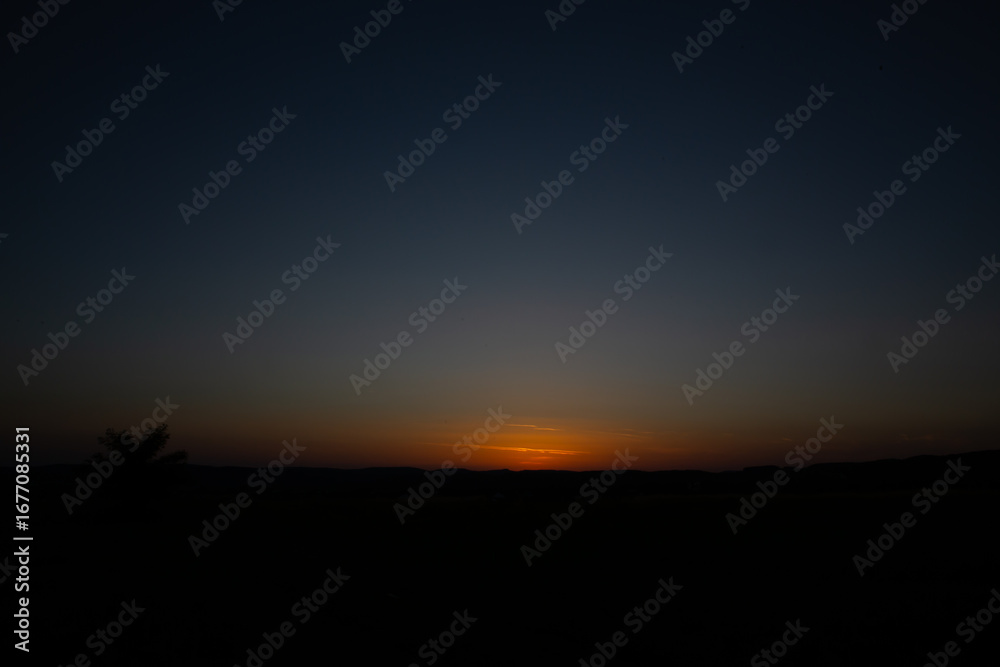 The sun descends, creating a breathtaking sunset over a serene landscape.