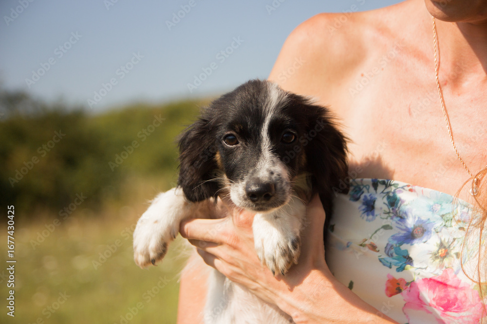 Black and white puppy in woman’s arms outdoors (horizontal)