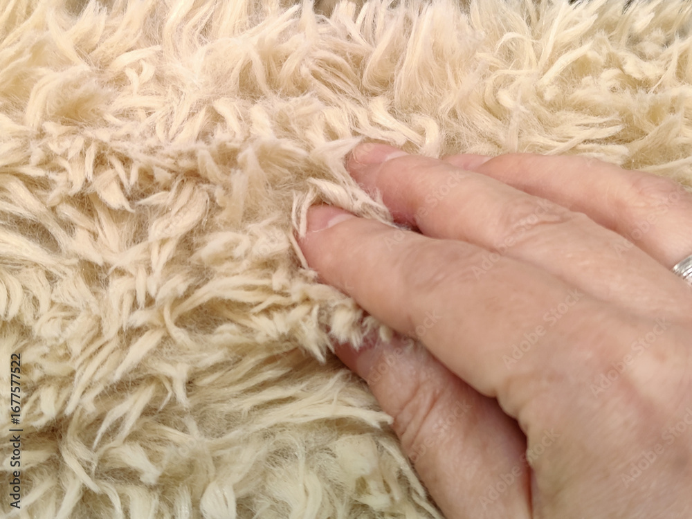 Womans hand feels fluffy long pile on beige carpet. Gentle touch, warm and pleasant to touch. Close-up. Selective focus.