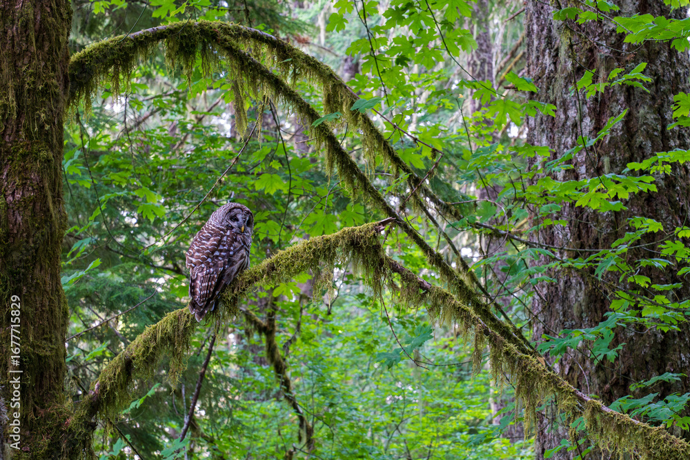 Barred-Owl (Stix varia) sits in a moss-covered Bigleaf Maple (Acer macrophyllum) in an old-growth Douglas Fir (Pseudotsuga menziesii) forest in Western Oregon.