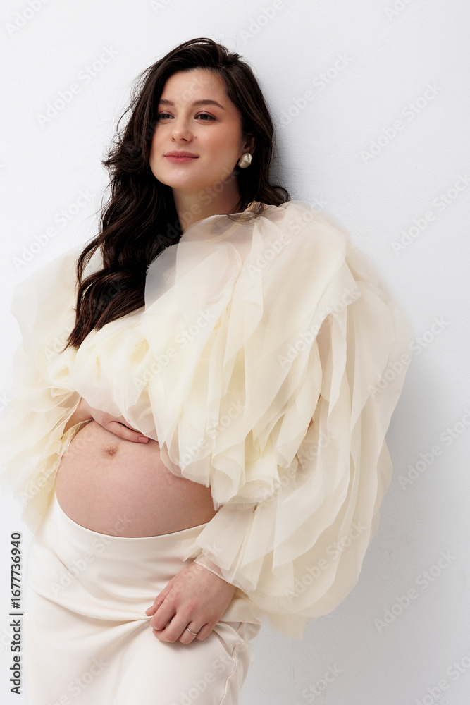 A woman in a white, ruffled dress kneels on the floor in a minimalist studio setting. She has long dark hair and is wearing yellow high heels. The background is plain and light-colored.