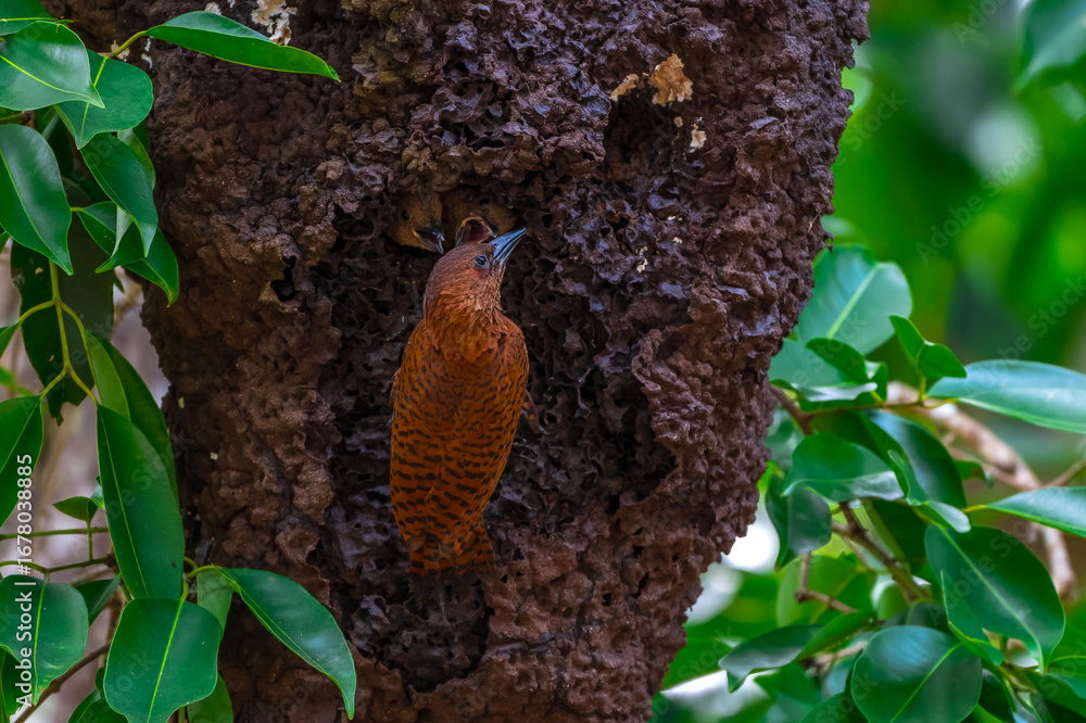 Reddish brown fur, short crest, dense black horizontal stripes on the upper body, short black beak, stripes on the underside of the neck. Male: red stripes on the cheeks. Thailand.