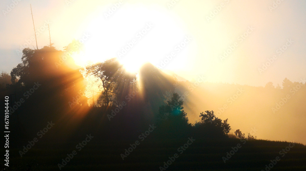 Beautiful Mountain landscape foggy windy mountain range green landscape asian farm. Amazing Landscape mountain green field meadow white cloud blue sky on sunrise. Countryside sunlight heaven scenery