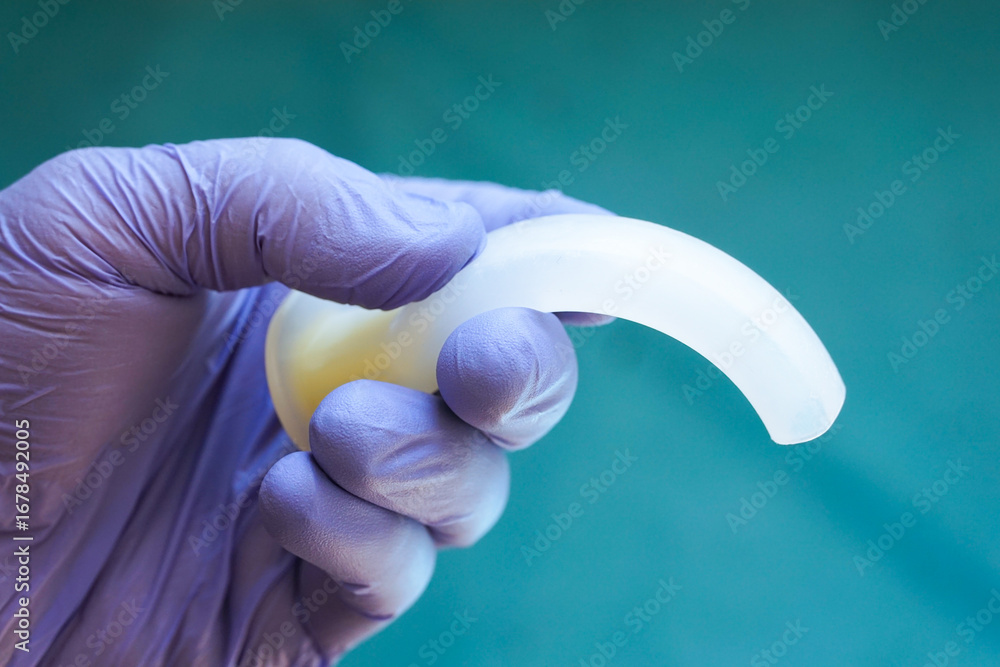 Oropharyngeal airway tube held in a gloved hand, ready for emergency use. Medical equipment for airway management, resuscitation, anesthesia, and first aid training.