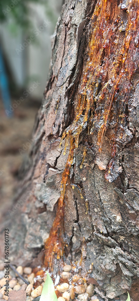 Natural liquid amber color resin of mahogany tree on the tree bark