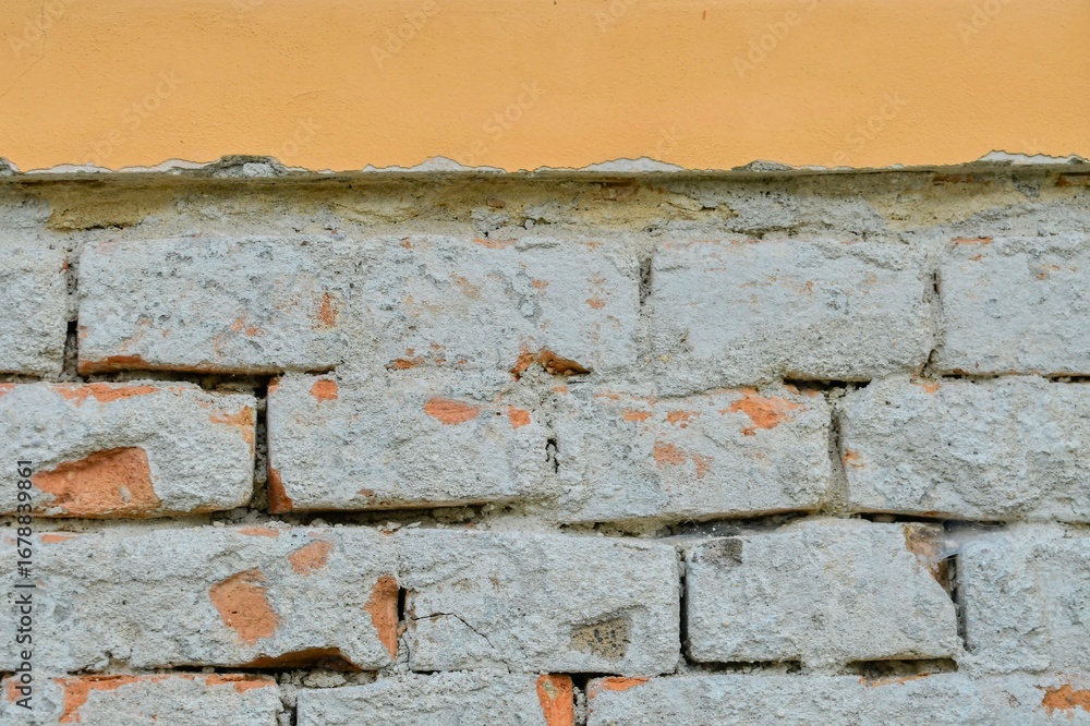 A chipped brick wall. Bricks with fragments of plaster. Textured wallpaper. Concept of building and masonry reconstruction.