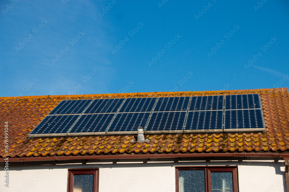 A view of solar panels on a roof top on a beautiful, bright, summers day.